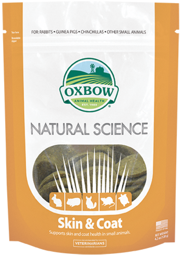 Skin & Coat è un integratore ad alto contenuto di fibre con diversi ingredienti vegetali per sostenere la salute dermatologica e cutanea del vostro animale domestico. La radice di bardana migliora il processo di rinnovamento del manto e supporta la funzione cutanea, mentre la camomilla aiuta a ridurre prurito e graffi. L'olio di palma rosso è una ricca fonte di acidi grassi essenziali. Gli animali da compagnia vivono più a lungo grazie ad una corretta alimentazioni, a cure adeguate e a visite abituali di controllo dal veterinario. I disturbi più comuni riscontrati dai veterinari in questi piccoli animali erbivori sono legati alla digestione, a infezioni al tratto urinario, a problemi alle articolazioni, problemi al pelo e alla pelle. Somministrare una tavoletta Natural Science Oxbow garantisce che gli animali ricevono l'intero supporto dell'integratore necessario per una salute ottimale. Skin & Coat non è da somministrare nell'acqua in quanto perde la sua efficacia, inoltre se lasciata nella ciotola dell'acqua del vostro animale potrebbe alterarne il gusto facendo ridurre o addirittura rifiutare l'acqua all'animale, questo può portare ad altri problemi di salute. Ingredienti Inattivi per 1 tavoletta: Fleolo, farina d’orzo, farina d’avena, melassa di canna, farina di semi di lino, lievito di birra secco, olio di palma rosso, olio di canola, radice di bardana, alghe. Principi Attivi Camomilla: 45 mg Radice di Bardana: 13.5mg Olio di Palma Rosso: 20 mg Olio di Colza: 20 mg. Istruzioni nutrizionali: Seguire tabella : Conigli, cavie, cincillà| Peso: 0-0.450gr | Dosi consigliate: Somministrare 1/2 Tavoletta al giorno Animale: Conigli, cavie, cincillà| Peso:0,450gr-1,8KG | Dosi consigliate: Somministrare 1 Tavoletta al giorno Animale: Conigli, cavie, cincillà| Peso:1.8KG + KG | Dosi consigliate: Somministrare 2 Tavolette al giorno Animale: Ratti, Degu| Peso: Tutti i pesi | Dosi consigliate: Somministrare 1/4 Tavoletta al giorno. Confezione da 120gr.