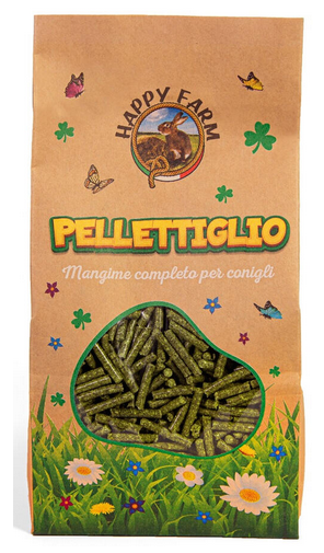 Happy Farm Pellettiglio è un mangime completo per conigli di tutte le eta’, prodotto dalla stessa azienda del fieno Happy Farm. COMPONENTI ANALITICI %: proteina grezza 14,00% cellulosa grezza 23,70% oli e grassi grezzi 2,50% ceneri grezze 10,00% calcio 0,50% sodio 0,12% fosforo 0,47% ADDITIVI PER KG (stg): VITAMINE, PROVITAMINE E SOSTANZE AD AFFETTO ANALOGO 3A672A VITAMINA A U.I 10.500 3A671 VITAMINA D3 U.I 1.050 3A700 VITAMIA E mg 35. COMPOSIZIONE: Fieno essiccato in campo,crusca di frumento, farina di estrazione da (semi) girasole, paglia di frumento, melasso di canna (da zucchero), baccelli di carruba essiccata, cloruro di sodio. COMPOSTI DI OLIGO ELEMENTI: E4 RAME (solfato rameico pentaidrato) mg. 10,50 SOSTANZE PER LA RIDUZIONE DELLE MICOTOSSINE 1M558 BENTONITE mg 10.000. ISTRUZIONI PER L’USO: Lasciare il mangime a libera disposizionedel coniglietto. Sacchetto da 1 kg.