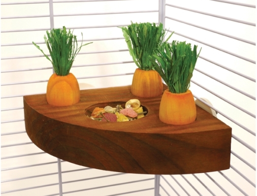Supporto/piattaforma angolare interattiva con 3 carote in legno. Dotato di vite per essere fissato eventualmente a gabbie o recinti. Adatto a coniglietti e roditori che possono rimuovere le “carote” con cui giocare o rosicchiare. La piattaforma contiene un quarto spazio circolare da riempire con mangime o premietti. . Il supporto misura 12 x 12 cm.